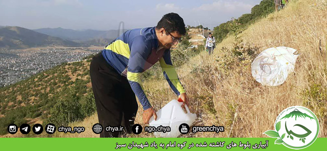 آبیاری بلوط های کاشته شده توسط اعضای گروه کوهنوردی چیا و گروه کوهنوردی کەویار در کوه امام به یاد شهیدان سبز