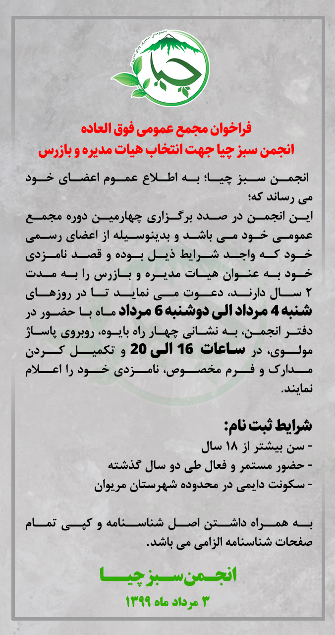 انجمن سبز چیا؛ به اطلاع عموم اعضای خود می رساند که؛